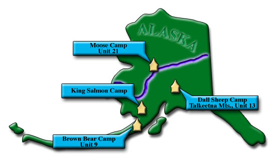 | All Registered Guide/Outfitters are allowed to operate in no more than 3 areas per season for Big Game Hunting. Kitchels Alaska Guide Service operates in units 9, 13, and 21. The spring bear hunting starts in May in these units. Brown Bears are hunted in unit 9,in early May, on even numbered years (2004), and Grizzly Bears can be hunted in units 13 and 21 in mid-to-late May each year. Brown Bear can grow to 10+, and Grizzly Bears grow to 9+. These animals are intelligent, beautiful, and extremely powerful. There is no Big Game Hunting during mid-Summer, so from June 15th to July 15th, we hunt for King Salmon, on the world famous Nushagak River. During this time, you can also catch Chum Salmon, Grayling, Dolly Virden, and even Pike. Also, during the end of July the Rainbow fishing really gets hot. August brings Dall sheep and mountain Grizzly season, which requires hiking in the mountains and enjoying spectacular scenery. This is one of the most demanding and rewarding hunts you will ever enjoy. These Rams average between 36 to 38 of horn length, and their coat is a brilliant snow white. September brings cool temperatures, vibrant colors of fall, and Rut-Crazed Bull Moose. These monsters are 7 tall at the shoulder, 1,500 lbs., and average 60 of antler spread. Other animals in season during September include, Grizzly Bear, Black Bear, Caribou, Wolf, and Wolverine. October is fall Brown Bear season on the Alaska Peninsula during odd years (2003). The bears have been eating fish all summer and fall, and are beginning to prepare for hibernation. Whatever your choice may be, Kitchels Alaska Guide Service will guide you on the hunt or fishing trip of a lifetime. Troy uses top-notch gear, provides 1st class meals, comfortable accommodations, and the customer service is second to none. Come join us for an unforgettable Alaskan Experience. |